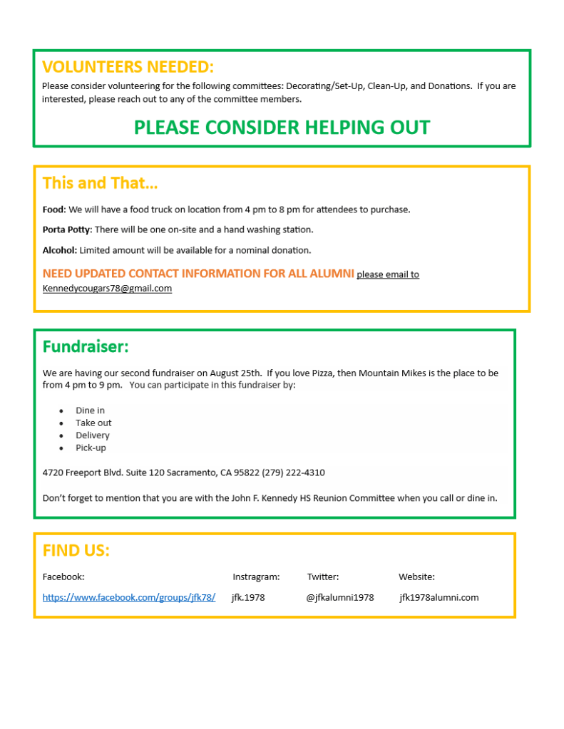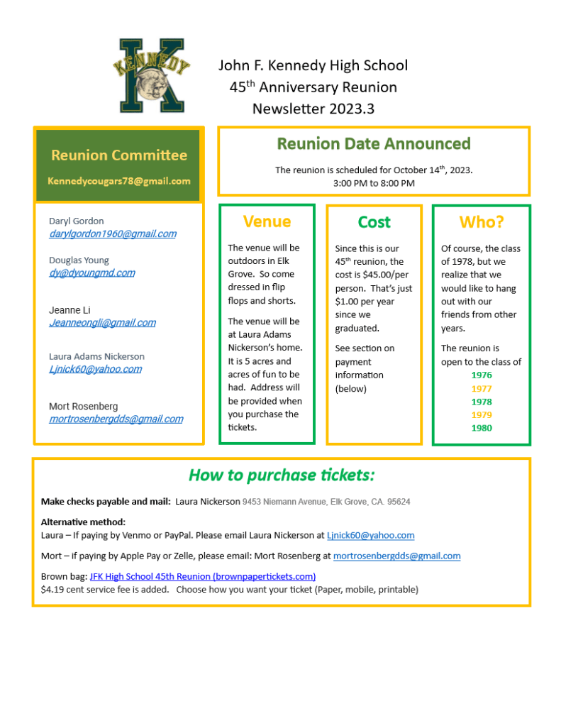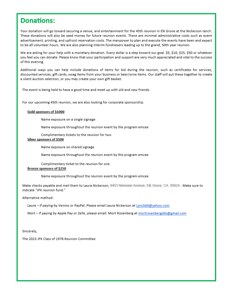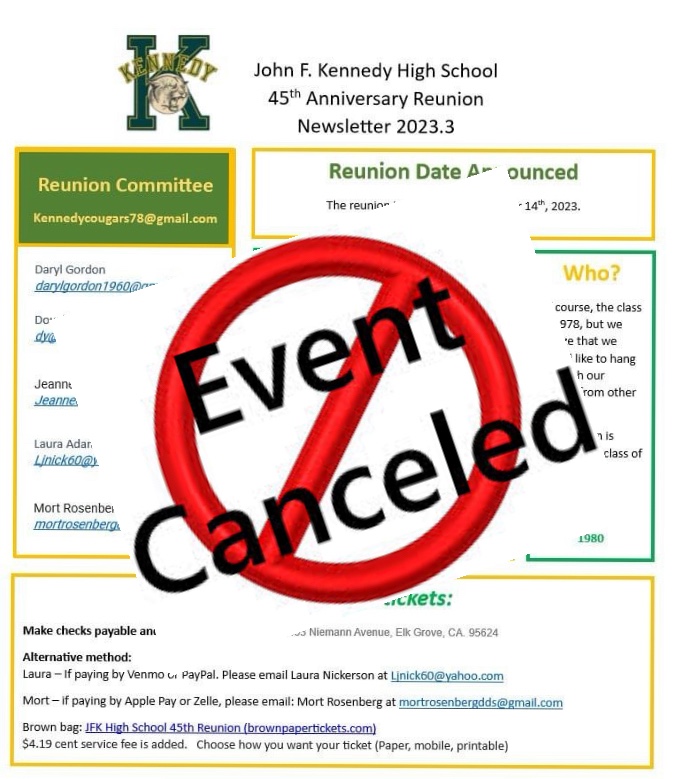 We’re sad to inform you that our 45th Class Reunion on October 14th has been cancelled. The difficult decision was to cancel the event because of low ticket sales. Planning this reunion meant that all the committee members paid out of their pockets to reserve the necessities for the event; we had a deadline to meet to not lose our deposits. We will still have a get-together on October 14th if you want to join us. It will be at a restaurant TBA. The reunion committee will go forward and start planning for our 50th reunion.